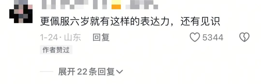 “佩服6岁就有这样的表达力,还有见识。”
